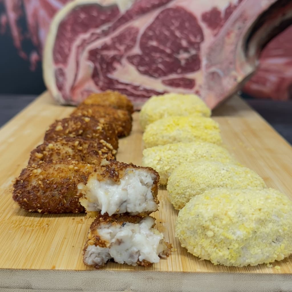 Nuestras croquetas de chuletón sin gluten son una auténtica joya artesanal, elaboradas con carne de chuletón de primera calidad para ofrecer un sabor intenso y lleno de carácter. Su bechamel suave y cremosa envuelve cada trocito de carne, creando un equilibrio perfecto entre textura y sabor. Con un rebozado crujiente y dorado, son ideales para disfrutar en familia, en reuniones o como un capricho gourmet en cualquier momento. ¡Perfectas para los amantes de la buena carne y las croquetas con personalidad